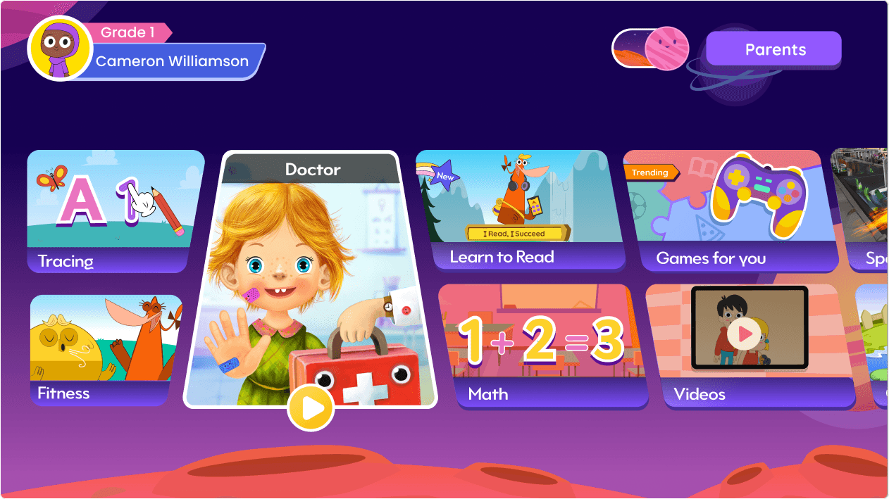The home screen had to stay simple enough for young kids, even though SKIDOS offers 40+ games, videos, and learning activities. The challenge was to surface this breadth of content without adding cognitive load.