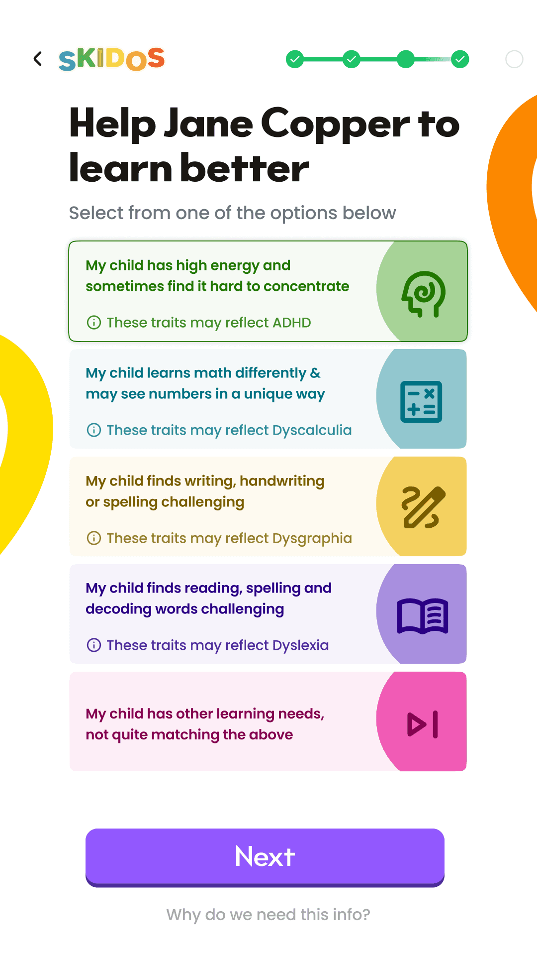 Instead of a generic subject picker, the new flow acknowledges neurodivergent needs and individual interests—making every learner feel seen and supported.